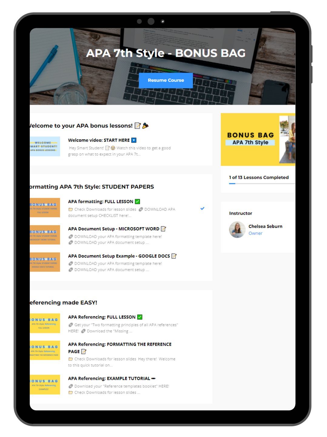Stay current with the most up to date APA formatting guidelines. This mini course walks you through the 4 main components of APA formatting giving you comprehensive lessons as well as example tutorials to help solidify your understanding.